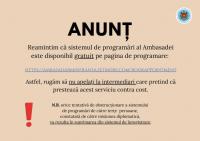 Atragem atenția Dumneavoastră că sistemul de programări al Ambasadei Republicii Moldova în Republica franceză a fost instituit și funcționează în scopul facilitării accesului cetățenilor la serviciile consulare. Reamintim că programările se efectuează gratuit, simplu și rapid, accesând pagina: https://ambasadarminfranta.setmore.com/bookappointment [link] Rugăm insistent să nu apelați la...Citește mai mult